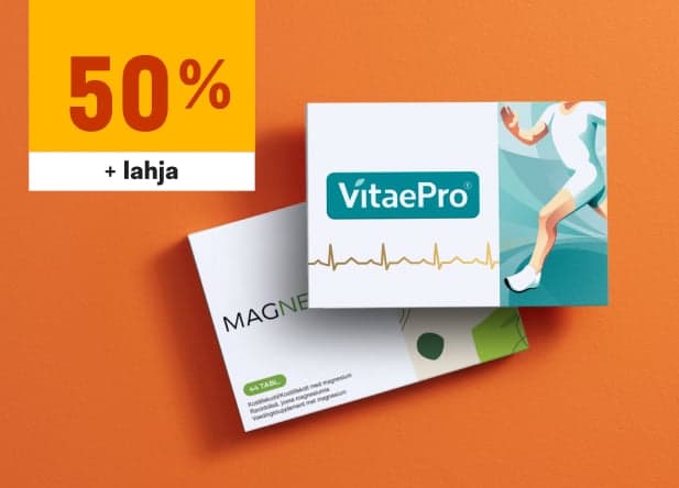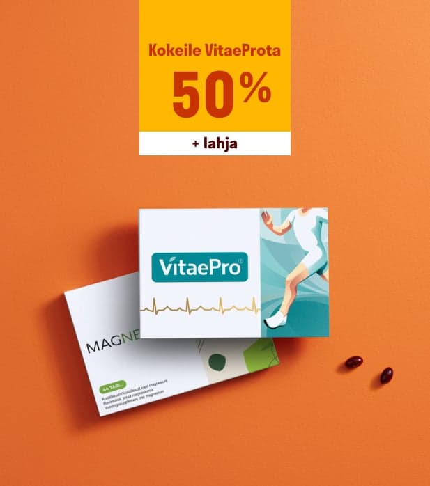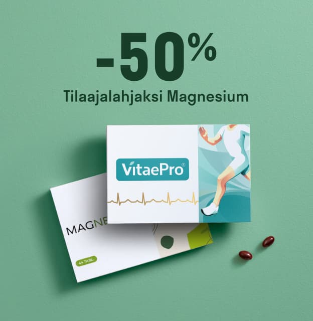 Jos tilaat VitaePron tänään, voit hyödyntää tarjouksen: Ensimmäinen paketti puoleen hintaan ja lahjaksi Magnesiun!